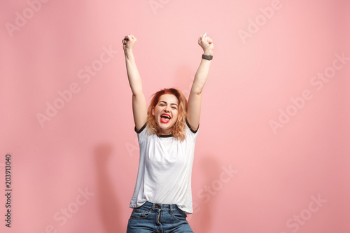 Winning success woman happy ecstatic celebrating being a winner. Dynamic energetic image of female model