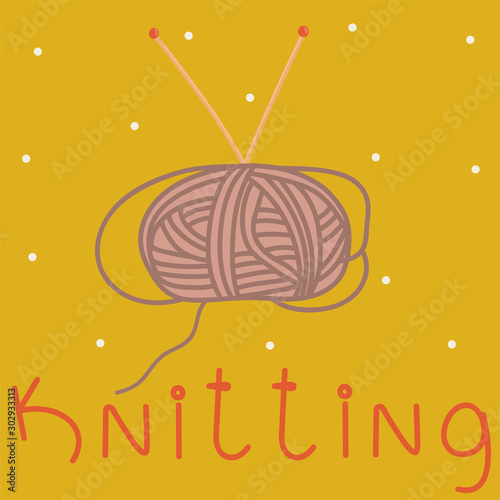 Winter card with hand drawn cartoon ball of yarn and needles. Christmas and New Year mood. Cute hand drawn vector print for poster, postcard ,t-short and ect.