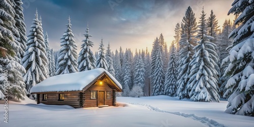 Winter cabin in a snowy forest landscape , winter, cabin, snowy, forest, landscape, frozen, woodland, wintry, scenery