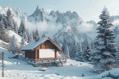 Winter Cabin with Blank Sign in Snowy Mountain Landscape.