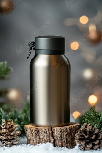 winter camping scene, vacuum flask rests on wooden stump in snowy setting with holiday decor, perfect for adding text or logo