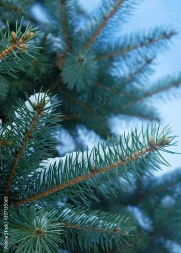 Winter christmas background with copy space, bokeh, snowflakes. Snowy landscape with fir branches. Blue toning