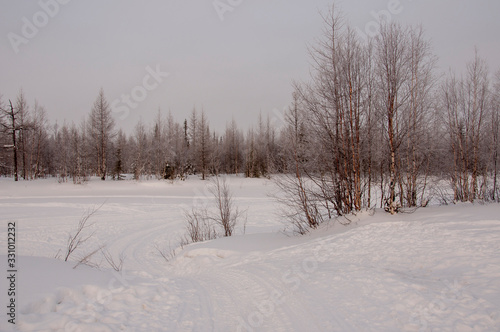Winter evening cold landscape with snow, forest and a lot of trees. Frosty weather
