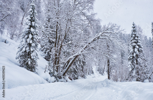 Winter forest road under heavy snow on the bank of Teletskoe lake. Iogach, Siberia, Russia