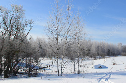 winter, snow, landscape, cold, forest, nature, tree, frost, sky, white, blue, snowy, glacé, scenery