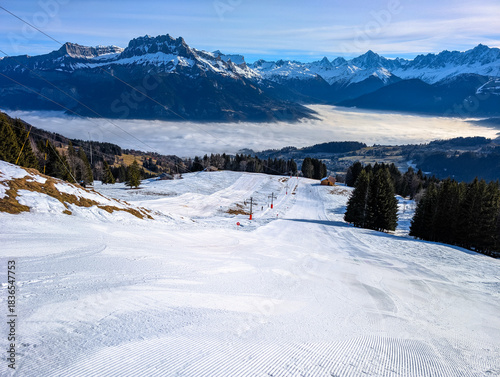Winter landscape and pistes at Cordon Ski Resort in French Alps