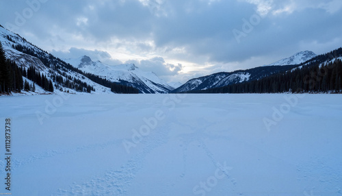 Winter landscape with a frozen lake surrounded by snow-covered mountains under cloudy sky