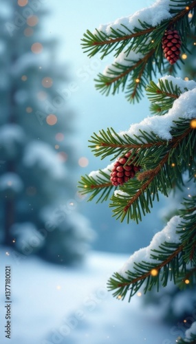 Winter Landscape with Fir Branches and Pine Cones, winter landscape, forest scene