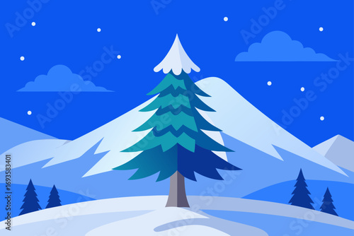 winter, snow, tree, landscape, mountain, cloud, sky, blue, white, pine, evergreen, cold, season, scenery, nature, background, scene, frost, holiday, illustration, design, snowy, peak, vale, hill, fir, spruce, tree branch, star, night, day, calm, peaceful, beauty, chill