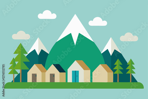 house, landscape, vector, home, illustration, sky, tree, village, building, nature, summer, cartoon, town, architecture, mountain, city, grass, spring, cloud, design, rural, green, icon, forest, country