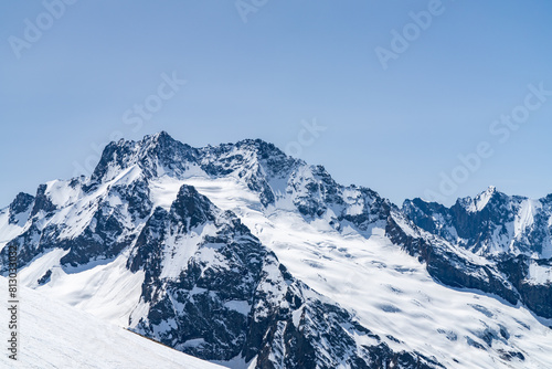 snow, mountain, caucasia, winter, landscape, mountain, sky, nature, peak, panorama, ice, rock, glacier, cold, travel, view, high, white, cloud, mount, panoramic, blue