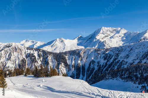 Winter panorama of snowy mountain range in 3 Valleys skiing, snowboard resort, Alps, France