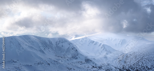 Winter panoramic. Landscape of high mountains with snow white peak. Forest. Lawn covered with snow. Evergreen trees in the snowdrifts. Christmas wonderland. Snowy wallpaper background.