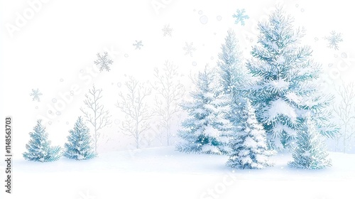 Winter Pine Forest Illustration, hand-painted conifer trees adorned with falling snow, captures a serene Christmas ambiance, perfect for festive decorations or seasonal art.