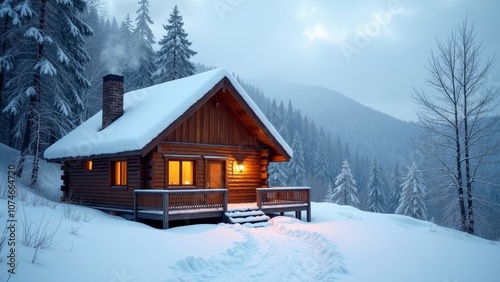 Winter Retreat: Cozy Mountain Cabin Surrounded by Snow-Covered Pines