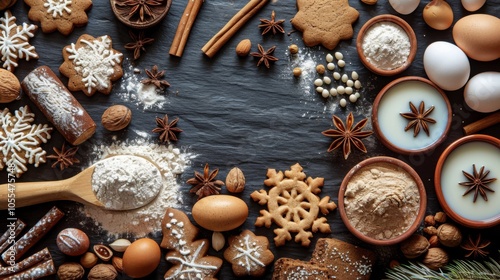 Winter season. Christmas, New Year cooking background. Baking ingredients and utensils - flour, rolling pin, gingerbread, milk, eggs. Making festive Christmas sweet cookies.