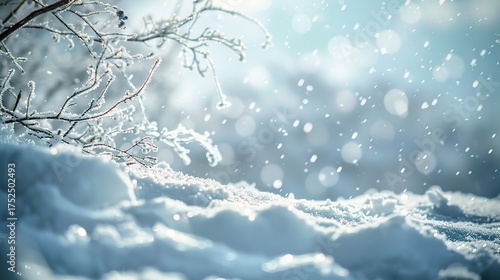 Winter Snow Scene with Snowflakes and Frosty Branches