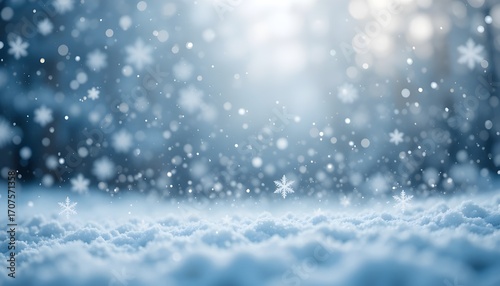 Winter Snowy Blurry Background with Falling Snowflakes in Light Blue and Silver Tones for Seasonal Designs