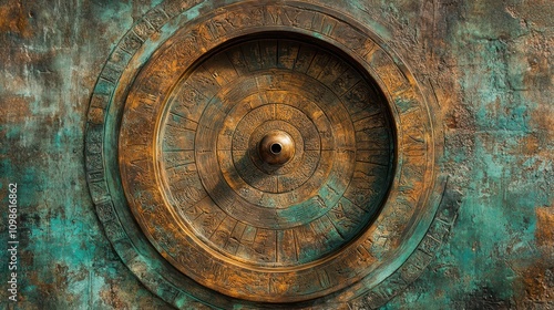 Winter Solstice Sundial with Celestial Symbols: Ancient Bronze Patina, Sacred Geometry Patterns, and Professional Artifact Lighting in Archaeological Photography Quality.