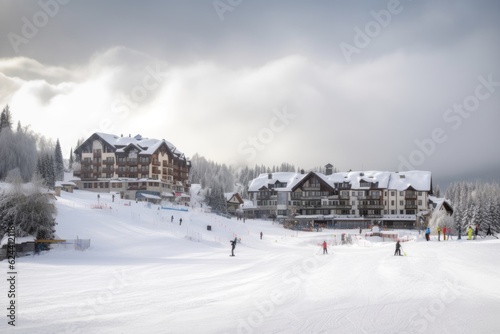 winter sports resort, with skiers and snowboarders enjoying the slopes, created with generative ai