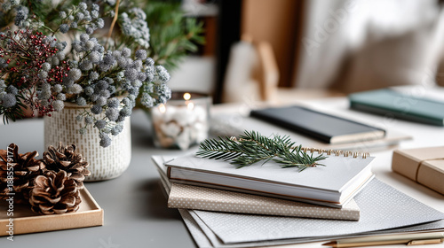 Winter stationery flat lay on desk, neutral seasonal decor, cozy minimal holiday atmosphere, notebooks and envelopes, soft shadows, with copy space