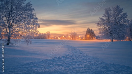 Winter sunrise over snowy landscape with city lights tranquil scene winter serene environment wide angle view