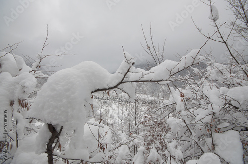 Winter trees in mountains covered with fresh snow. Beautiful landscape with branches of trees covered in snow. Mountain road in Caucasus. Azerbaijan