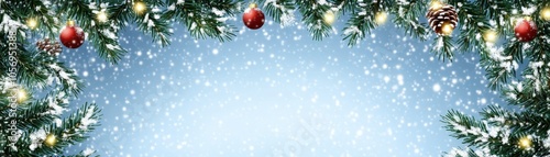 winter, pine, branch, ornament, christmas, holiday, light, decoration, festive, seasonal, snow, background, nature, evergreen, needle, sparkle, twinkle, glowing, cosy, warm, elegant, traditional, celebration, bright, shiny, red, green, frame, border, panorama, template, copy, space, text, image, photo, blur, defocused, sharpened, depth
