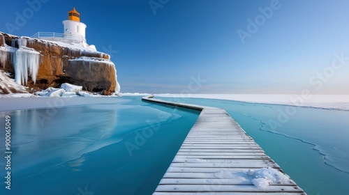lighthouse, winter, glacé, lake, ice, snow, pier, wooden, dock, blue, sky, cold, nature, landscape, scenic, travel, photo, background, wallpaper, postcard, water, calm, serene, peaceful, tranquil, solitude, isolation, whimsical, magical, wonderland, leading