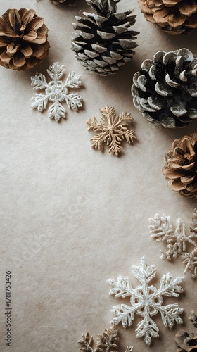Winter wonderland pine cones and snowflakes on rustic background cozy indoor decor festive vibe