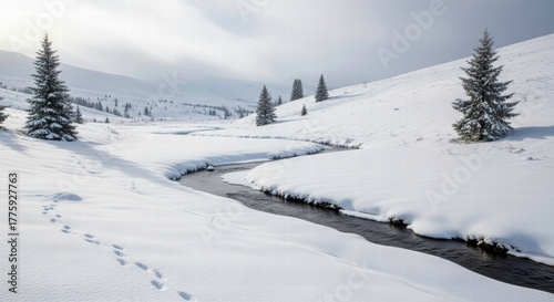 Winter Wonderland Scene: A serene winter landscape unfolds, with a winding stream carving its way through a snow-covered terrain, accented by scattered evergreen trees.