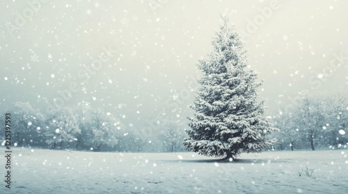 Winter Wonderland Scene Featuring Snow-Covered Evergreen Tree in a Snowfall Atmosphere with Soft Grey Background and Blank Space for Text