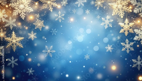 Winter wonderland snowflakes falling over sparkling blue background holiday season digital art magical atmosphere aerial view seasonal serenity and beauty