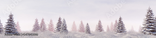Winter Woodland with Snow covered Trees in a Pale Mist. Seasonal Banner.