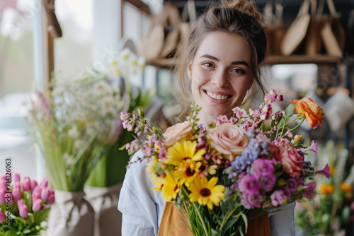 With a vibrant flower bouquet in hand, a young florist embodies creativity, kindness, and love, shining with joy