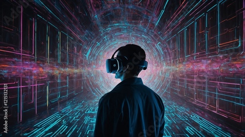 Within a mesmerizingly intricate network of glowing circuits and swirling data streams, a figure stands at the center, in a futuristic world of virtual reality. This acrylic painting showcases a techn