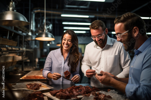 Within the tasting lab, a group of technologists tastes and evaluates a recipe, each individual's smile mirroring their dedication to creating exceptional meat products.