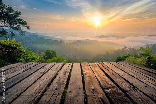 Witness the serenity of an old wooden terrace overlooking a fogladen valley at sunrise, Sharpen Landscape background