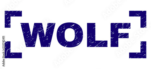 WOLF tag seal print with distress texture. Text tag is placed between corners. Blue vector rubber print of WOLF with grunge texture.