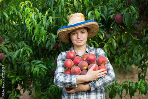 Woman professional gardener holding stack of fresh peaches
