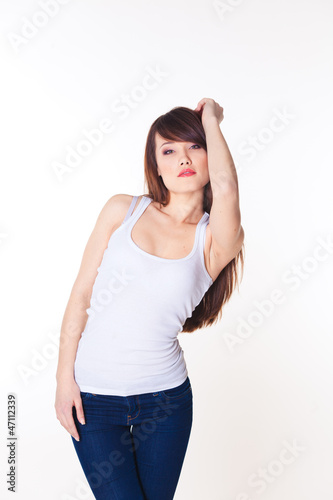 adult, attractive, background, beautiful, beauty, brunette, carefree, casual attire, caucasian, cheerful, clothes, cute, elegant, excited, expression, face, fashion, female, girl, hair, happiness, happy, healthy, isolated, jean, life, lifestyle, look, make-up, model, natural, 1, people, portrait, posing, positive, pretty, sensual, serious, sexy, smile, studio, style, thumb up, white, woman, young