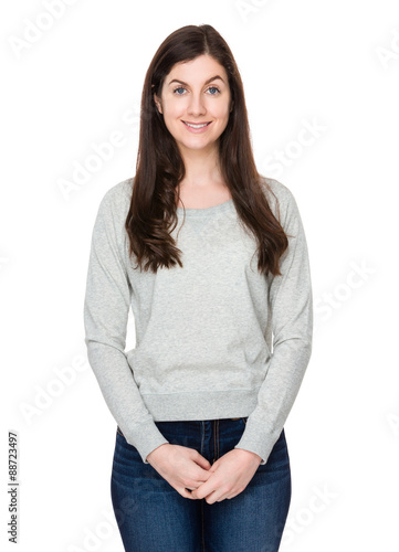 woman, lady, girl, female, casual attire, wear, tee, long, sleeve, adult, simple, blank, design, logotype, confident, smart, successful, smile, happy, friendly, nice, success, natural, attractive, great, pleasure, racked, isolated, white, background, people, person, portrait, 1, young, mature, beautiful, pretty, caucasian, european, brunette, brunet, latin