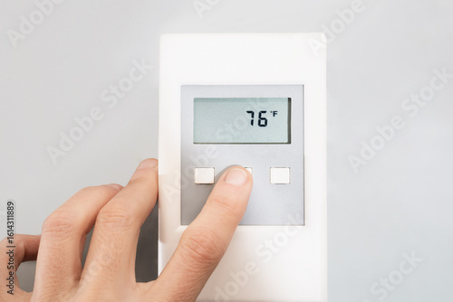 Woman adjusting temperature with digital thermostat or a temperature controller. 76 Fahrenheit is on the display. Regulating room temperature or trouble shooting water tank problem. Selective focus.