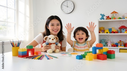woman, children, toy, teddy bear, building blocks, table, clock, shelf, toy, smile, hand, colourful, indoor, light