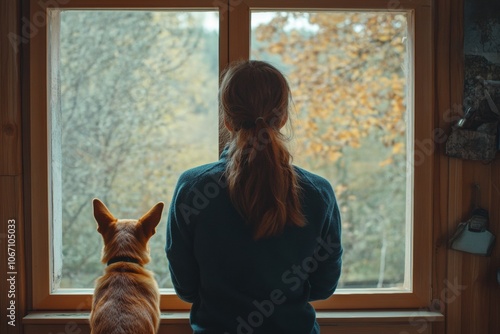 woman, dog, window, autumn, looking, scenery, cabin, cosy, nature, fall, leaf, tree, landscape, view, home, indoor, pet, companionship, relaxation, peace, calmness, contemplation, solitude, togetherness, bonding, love, friendship, warmth, comfort, season, change, gold, colours, orange