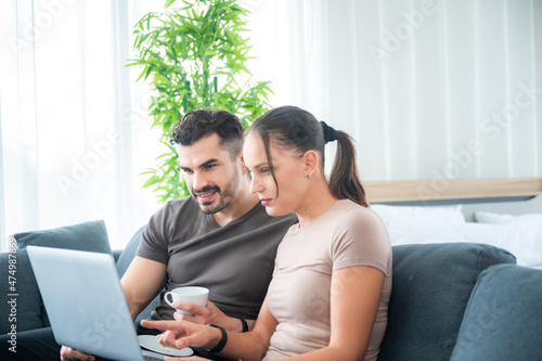 woman and man couple working online with laptop for business work at home, happy indoor lifestyle