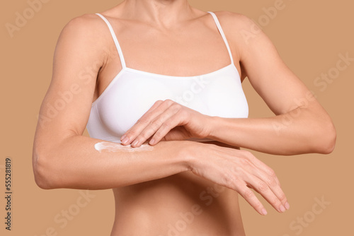Woman applying body cream onto her arm against beige background, closeup