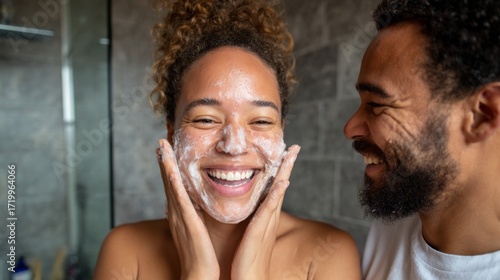 face mask, skincare, couple, joyful, happy, smiling, black woman, grooming, bathroom, home, beauty, love, happiness, beauty product