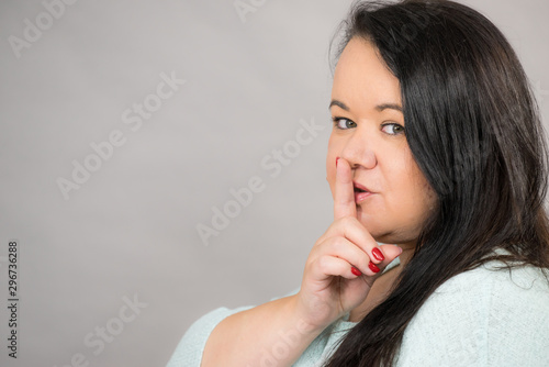 asking, calm, discretion, finger, gesture, gossip, speechless, hand, hush, lip, mouth, noise, quiet, secret, shh, signs, silence, silent, whisper, whispering, mute, woman, taboo, blank, space, big, adult, plus, size, fat