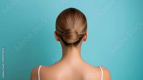 woman, female, back, hair, coiffure, bun, simple, elegant, beauty, fashion, model, portrait, studio, blue, background, minimal, natural, view, young
